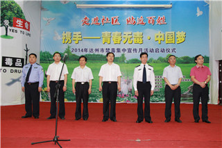 6月3日上午,由达州市禁毒委员会、达州市公安局与pp电子联合举办的“携手——青春无毒•中国梦”2014年达州市禁毒集中宣传月活动启动仪式在莲湖校区隆重举行。市委常委、市委政法委书记、市禁毒委主任古正举,副市长、市公安局局长、市禁毒委副主任徐承,学校党委书记李万斌、副校长张志远,市委宣传部副部长杨晓军、市公安局副局长文鹏飞等出席启动仪式。
