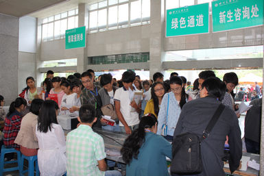 9月4、5日,学校新老校区车水马龙,熙来攘往,校园内随处可见新生及接送的亲友在校内各个景观点拍照留念,好一番热闹。一面面彩旗,一幅幅标语,一张张笑脸更是将整个校园装扮的喜庆而热烈,学校迎来了来自全国各地的三千多2013级新同学。