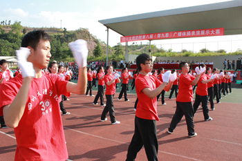 为进一步推动学校“阳光体育活动”深入开展,切实增强学生体质,促进学生全面健康发展, 2013年4月23日,pp电子在莲湖校区运动场举行了第八届(第九套)广播操表演展示大赛。党委书记李万斌教授、校长孟兆怀教授、副校长张志远教授、副校长王洪辉教授、副校级调研员成良臣教授等学校领导出席大赛,各教学系党总支书记、副书记及全体辅导员观看了比赛。本次大赛由学校党委副书记、纪委书记、工会主席李佳国教授主持。