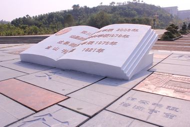 《基石》 采用石块构建出整个景观空间,地面由花岗岩铺装而成,其间雕刻与“文”、“理”、“德”、“行”相关的名言警句加以点缀。学子们经过这里,脚下踩踏着一块块石料,其行为过程提醒他们:在迈入校园的第一步,就须有“脚踏实地”的治学态度。同时,脚下触及的粗糙之感传递出治学、治校的艰辛,而漫步于诗句之间,又能体会到“文”、“理”、“德”、“行”所蕴含的深刻含义。在景观的中心,一本汉白玉雕琢的大书被另两本重叠的书从地面托起,并翻开。书的设置象征着知识的广博与深厚,勉励学子“读万卷书,行万里路”。