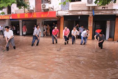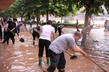 早上7点半,我院教师便携带各类清淤工具早早来到滨河路。此时,州河水位依然很高。八时左右,随着被淹的门市渐渐露出水面,大家纷纷穿上水靴,前往指定的清淤路段。一些个体工商户早已开始清扫自家店铺,老师们见状迅速参加到清淤工作中,帮助他们铲淤泥,扫垃圾,冲洗各类残留物。他们看到老师们认真的干劲和无私的援助,十分感慨地说,你们的帮助让我们感受到了集体的温暖和无限的大爱,让人感动。