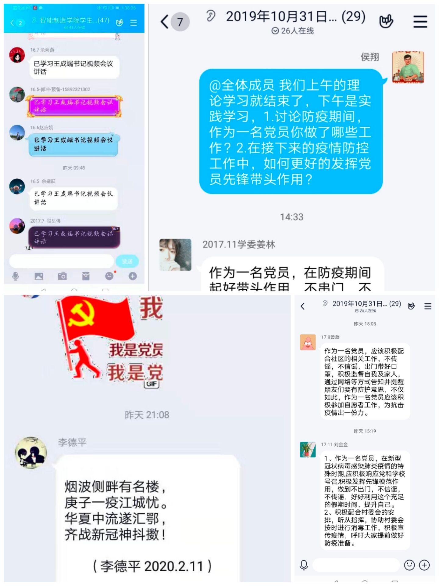 2月11日,智能制造学院学生第一党支部和学生第二党支部共91名党员和17名发展对象如约在党员群集合,在线传达学习习近平总书记关于坚决打赢疫情防控阻击战的重要指示精神、学校党委书记王成端《在学校防控新型冠状病毒感染的肺炎疫情防控工作领导小组会议视频上的讲话》和20余位“火线上共产党员”的先进事迹,并开展了线上讨论。大家踊跃发表感言,或撰文或写诗。向婷婷同学说“我在感动中发奋,在激昂的战歌中前行”。姜林同学说:“作为一名党员,除了自觉引导自己和家人做好防护之外,还应积极配合村委做一些力所能及的工作”。周思宏同学说:“强风知劲草,烈火炼真金,作为新时代的青年党员,应勇于承担应有的责任与担当,在关键时期挺身而出”,“春疫蔓发千门闭,逆行直上青史记”,“华夏神州同心志,当扫阴霾现碧空”,“华夏中流遂汇鄂,齐战新冠神抖擞!” 大家一致坚信在以习近平同志为核心的党中央坚强领导下,我们一定能够战胜这次毒疫。