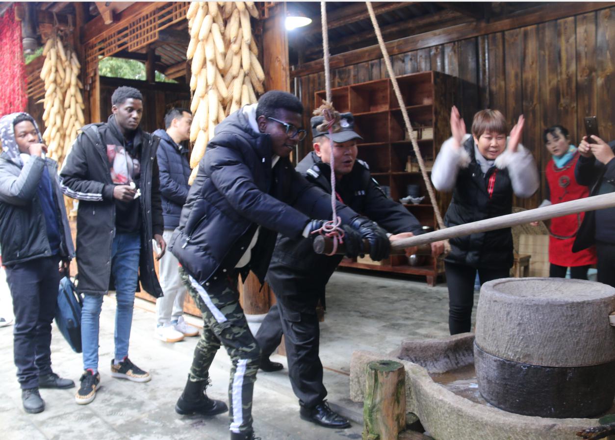 他们还参与到锯木头、刨木材、推石磨等互动体验活动中,对中国的木器制作、豆腐传统制作技艺、传统石磨使用方法、酿酒工艺加深了认识和了解。