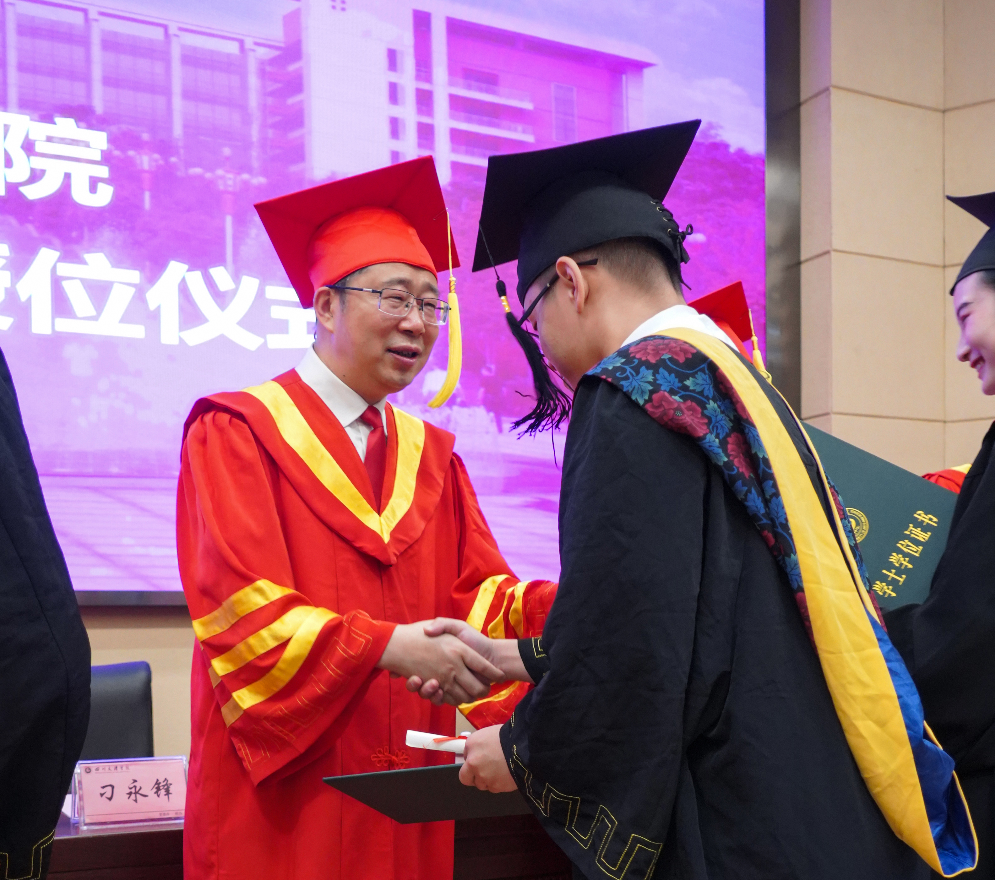 当陈彦蓉同学坐着轮椅在母亲、老师和同学们的陪伴下入场时,全场报以热烈的掌声,师生们纷纷起立,注视着这位坚强的学子和她伟大的母亲。学校学位评定委员会主席、校长刁永锋教授从台上快步走下,捧着沉甸甸的学士学位证书,来到陈彦蓉同学的面前,躬身为她拨穗授位,眼光中充满慈爱和期许。