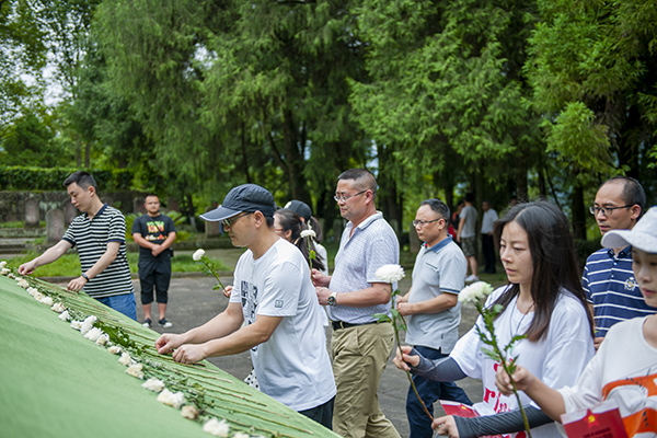 全体党员乘车来到通江县王坪村——全国爱国主义教育示范基地川陕革命根据地红军烈士陵园。在解说人员的带领下,同志们怀着无比崇敬与沉重的心情,沿着千秋大道缓步来到红四方面军烈士墓碑,向革命烈士默哀、鞠躬,并敬献鲜花,向长眠青山的革命英烈表达深深的怀念和敬仰之情。同志们聆听革命先烈的感人故事,追思革命先烈的丰功伟绩,深入了解红军精神的深刻内涵。随后大家拾级而上,经红军烈士集墓区、无名烈士纪念园,登上烈士陵园的最高处,瞻仰高大雄伟、庄严肃穆的红军“英烈墙”,看着一块块白色墓碑,仰望着一个个刻在大理石上先烈们的名字,同志们感叹江山来之不易,心灵再次受到洗礼,深深感受到了红色精神的力量,倍加珍惜和平年代的幸福生活。据了解,这里长眠着25048名红军烈士,是全国最大的红军集墓。
