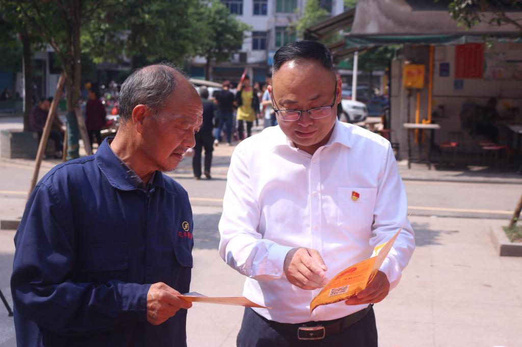 党员同志和志愿者们向社区居民分发党史宣传册,并与社区群众共同回顾中国共产党的百年光辉历史。