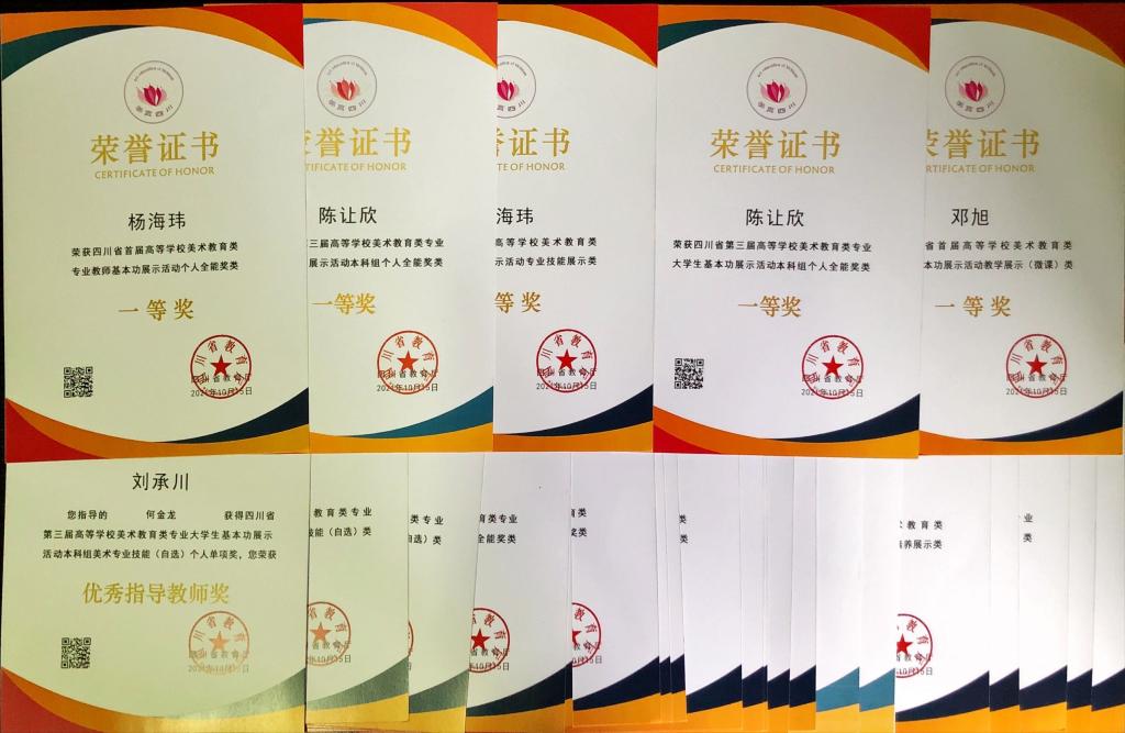 10月11日至15日,四川省首届高等学校美术教育类专业教师基本功和第三届高等学校美术教育类专业大学生基本功展示活动在成都师范学院举行。pp电子有6位师生参赛,共获得一等奖10项,二等奖5项,5人获得优秀指导教师奖。