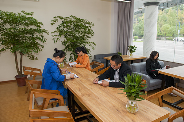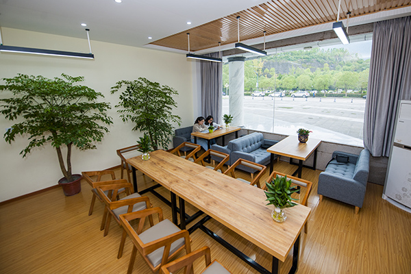 教师休息室温馨而明亮,主要分为三个区域:会议区、讨论区和休息区。每间休息室可容纳20余名老师同时使用,配置了条桌、椅子、茶几、沙发、书架、电脑桌、空调机、饮水机等设备,装点了绿色植物,放置了报刊杂志,WIFI网络全覆盖。灯具、木地板和墙面色泽搭配恰当,窗明几净,是一个温馨优雅、舒适安静的教师工作环境。