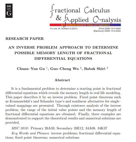 近日,数学学院古传运博士以第一作者,与数据恢复四川省重点实验室吴国成教授团队合作在分数阶微积分学领域国际顶级学术期刊《Fractional Calculus and Applied Analysis》发表题为《An inverse problem approach to determine possible memory length of fractional differential equations》的学术研究成果。这个期刊在分数阶微积分学领域有较高的学术影响力和知名度,为中科院大类分区一区期刊,2021年影响因子为3.126。