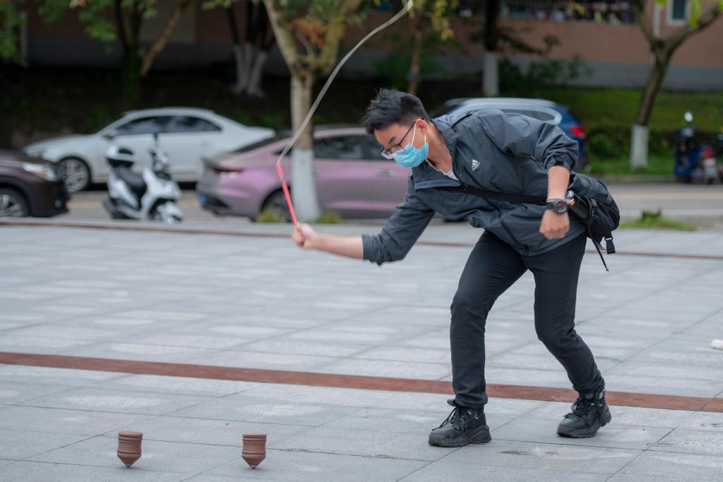 一个陀螺、一条鞭,一支利箭、一张弓,传统的体育项目原来是同学们儿时的玩具。一群人都跃跃欲试,迫不及待要体验一把。传统体育跟现代体育最大的不同就在于传统体育更注重趣味性和娱乐性。中华民族从来都不是争强好胜的民族,我们从骨子里就崇尚和平与团结,注重和谐与中庸。所以我们一代一代传下来的体育项目也讲究中庸之道、和谐之美。