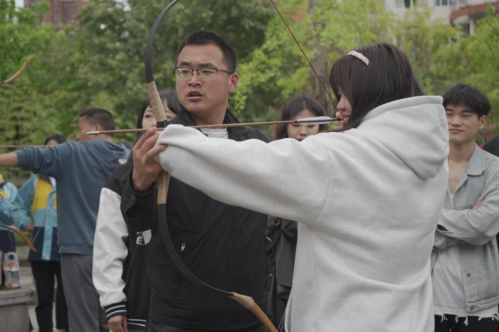 他还说,当咱们去射箭的时候,讲究不偏不倚,太往左、太往右,或往上往下,都不好。讲究的是一个“中”字,不能走极端。而每次射完箭之后都要把弦取下来,这就是文武之道,要一张一弛。长时间保持一个紧绷的状态,弦受不了,弓也受不了。让弦松一下,然后再射箭的时候,就会更好。而且通过射箭还可以锻炼学生的专注力,训练学生心稳、手稳、身稳。