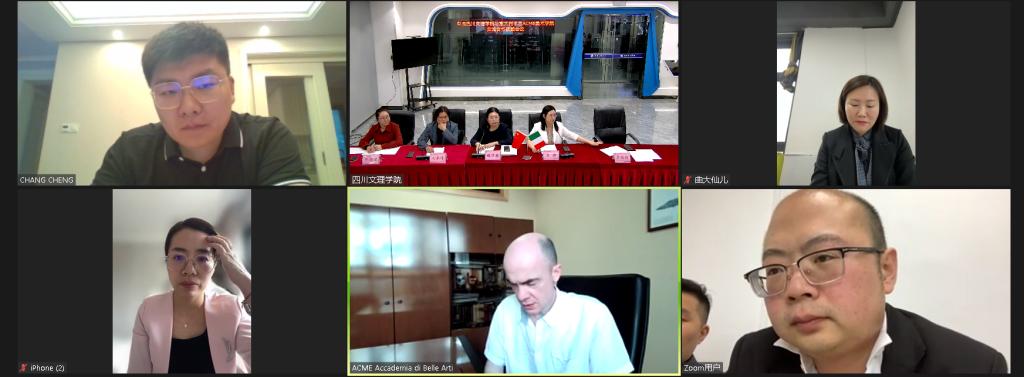 5月18日下午,学校与意大利米兰ACME美术学院召开了合作交流视频会议。米兰ACME美术学院院长Pietro Previde Prato及院长助理Jacopo Melzi、中方代表郭承,pp电子副校长程碧英、美术学院院长刘承川、国际交流合作处处长李锣参加会议。