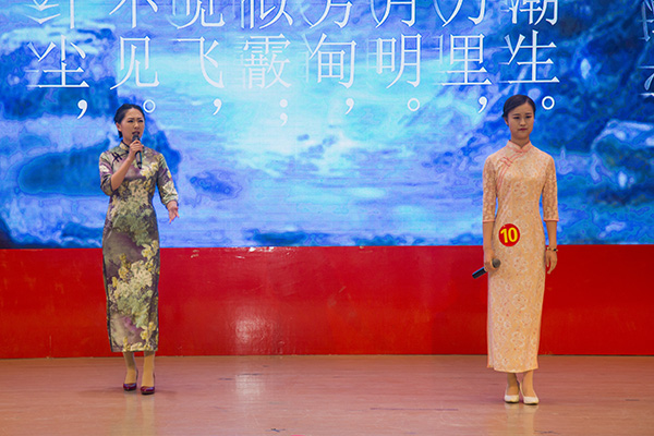 进入决赛的12组学生尽显风采,从《短歌行》《桃花源记》等脍炙人口的诗篇,到气势磅礴的《蜀道难》《将进酒》《念奴娇·赤壁怀古》,从离情别绪的《春江花月夜》,到表达家国情怀的《岳阳楼记》《满江红》,再到抒发细腻真挚个人情感《白头吟》《木兰诗》……选手们的朗诵内容别致,感情充沛,处处散发着诗情画意。最终,赵武诚、周茉的《白头吟》、朱九六的《念奴娇·赤壁怀古》获得一等奖,姚海程等三组选手获得二等奖,任卿慧等四组选手获得三等奖。