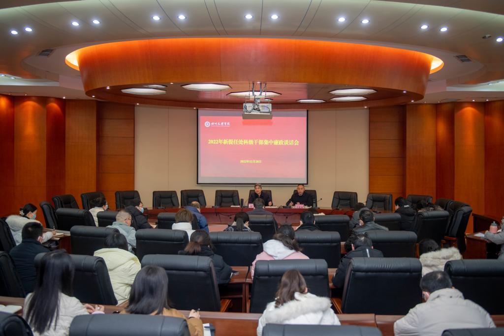 12月28日,学校举行了2022年新提任处科级干部集体廉政谈话会。驻校纪检监察组组长、党委副书记、纪委书记张超出席会议并讲话,党委常委、组织部长涂德祥主持会议。