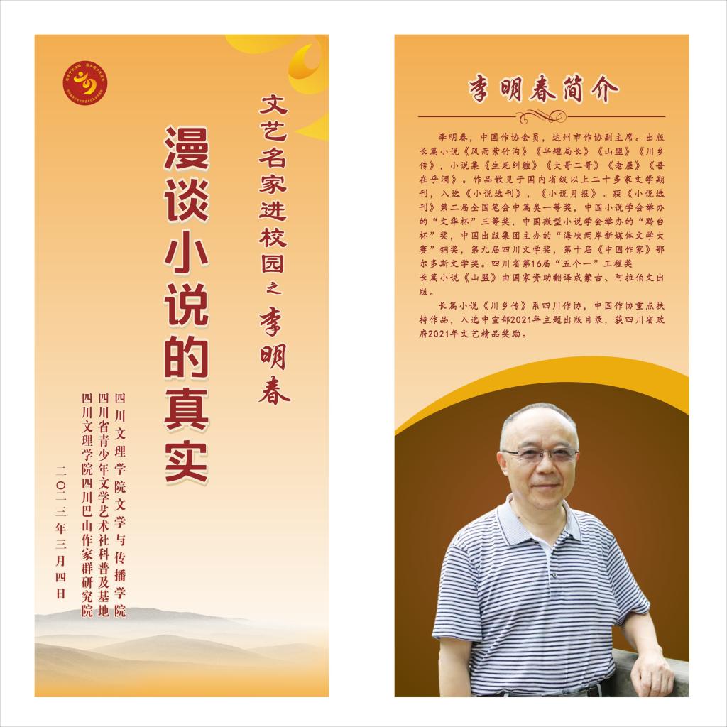 3月4日,在莲湖校区多功能厅,“文艺名家进校园”系列讲座开启了今年春天的第一讲。此次邀请的是巴山作家群的优秀代表李明春老师。他以“漫谈小说的真实”为题热情分享了自己的写作经验。讲座由文学与传播学院院长曾宪文教授主持。