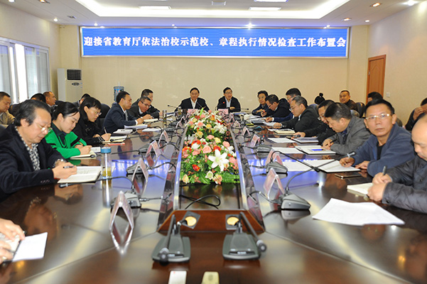 党委书记王成端向与会同志宣读《四川省教育厅关于开展2017年省级依法治校示范学校抽查工作的通知》和《四川省教育厅关于开展第二批高等学校章程执行情况检查的通知》的有关工作安排。他要求与会全体干部要进一步学法、知法、懂法、守法,认真落实教育部《全面推进依法治校实施纲要》,牢固树立依法办事意识和法律面前人人平等的法治观念,尊重学校章程,全面深入推进依法治校,建立公正合法、系统完善的制度与程序,保证学校的教学活动、教育管理与制度规范符合民主、法治、自由、平等、公平、正义的社会主义法治建设要求。