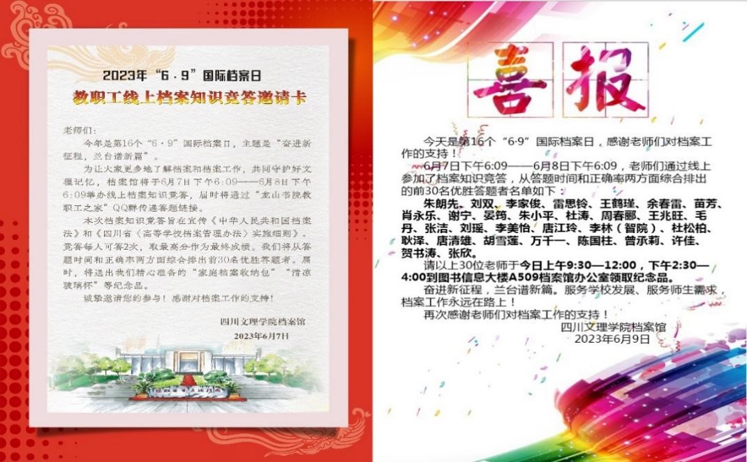 “奋进新征程 ,兰台谱新篇”。 在第16个“6·9”国际档案日集中宣传周期间,档案馆面向师生推出教职工线上档案知识竞答、学生百人接力读档、档案开放日、推送毕业生档案服务卡等有意义、有温度、有感染力的系列活动,让档案走近师生,让师生走进档案馆,在档案服务师生的真实体验中营造档案工作良好氛围。