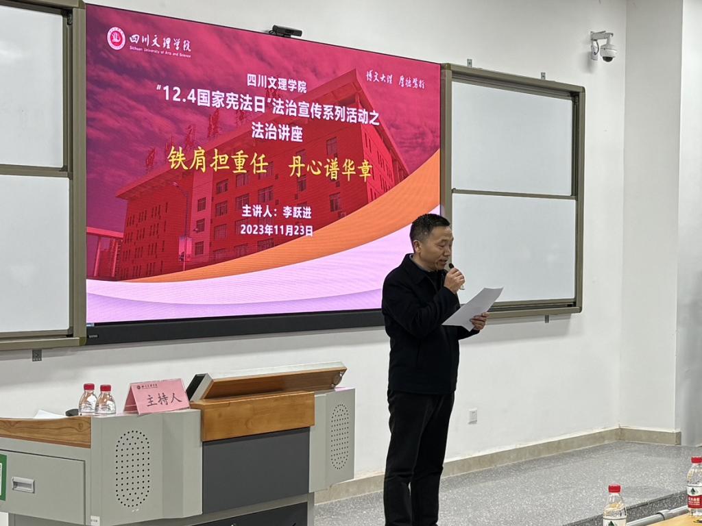 为深入学习贯彻习近平法治思想和做好2023年“宪法宣传周”系列活动,11月23日,达州市人民检察院第二检察部主任李跃进走进pp电子为师生作“铁肩担重任,丹心谱华章”法治讲座,政法学院&知识产权学院党委书记岳臣忠主持本次讲座。