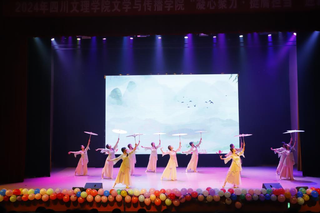 晚会在主持人一声声亲切友好地问候和观众们的欢呼声下拉开帷幕。伴随着激昂的音乐响起,开场舞蹈《热烈2024》瞬间调动现场的气氛。整场迎新晚会分为:“青青子衿·志怀家国”和“灼灼风华·向阳追梦”上下两个篇章。新时代的号角已经吹响,文传学子的冲锋永不停歇,每个节目都展现出文学与传播学院深厚的文化内涵。