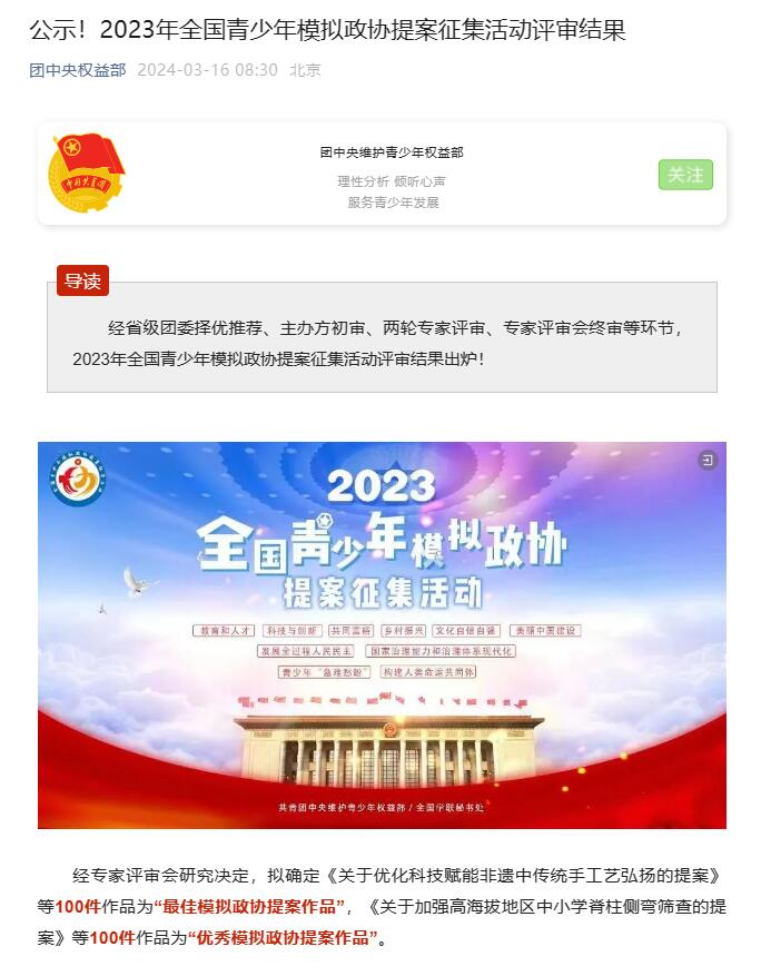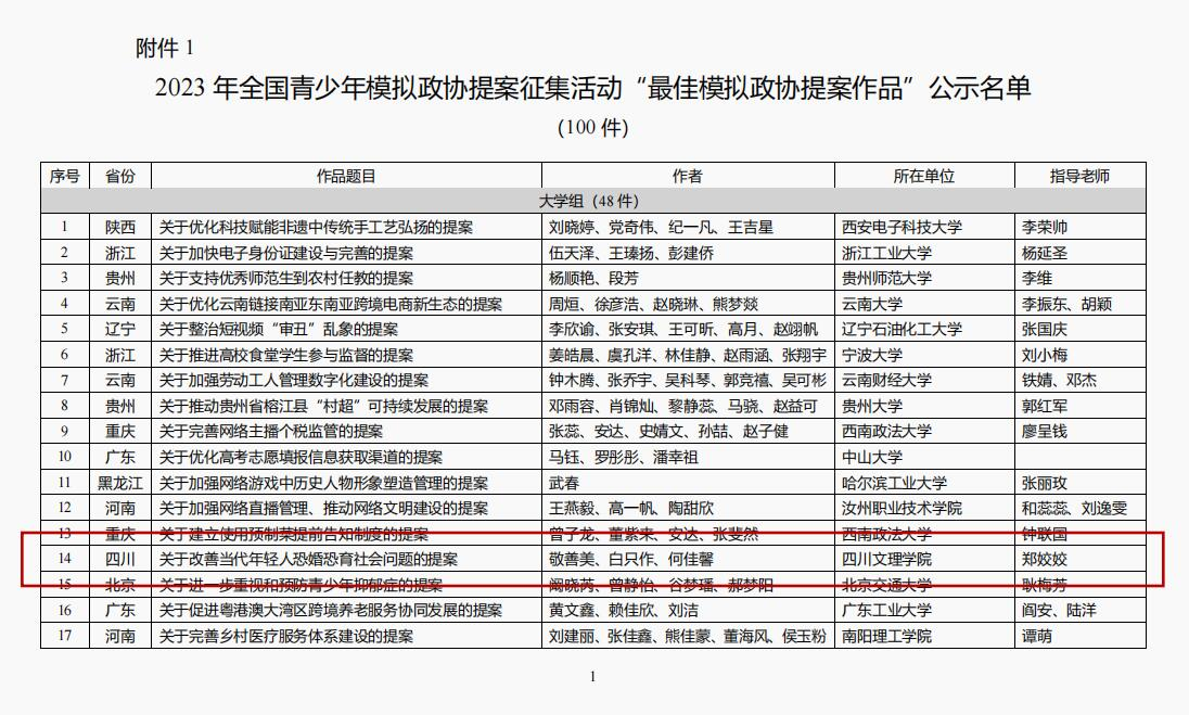 近日,团中央权益部公示了2023年全国青少年模拟政协提案征集活动评审结果,由pp电子敬善美、白只作、何佳馨同学组队申报,郑姣姣老师指导撰写的《关于改善当代年轻人恐婚恐育社会问题的提案》荣获2023年全国青少年模拟政协提案征集活动“最佳模拟政协提案作品”。
