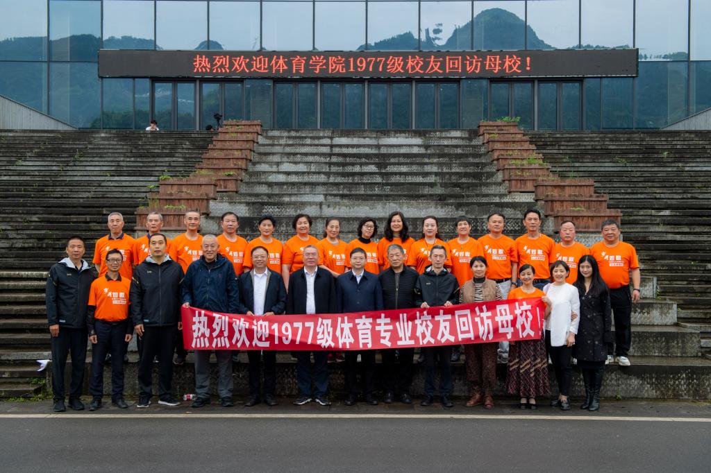 近日,体育学院原体育教研室部分教师邓朝胜、杨渝、何淑云和1977级的首届校友们相聚母校。校长侯忠明与他们亲切交流并合影留念。