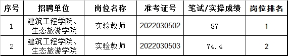 《pp电子官方网站关于公布2022年3月非事业单位编制招聘面试入围人员名单的公告》中建筑工程学院、生态旅游学院实验教师岗报考者专业实操成绩公布有误,现将本岗位报考者专业实操成绩更正如下。