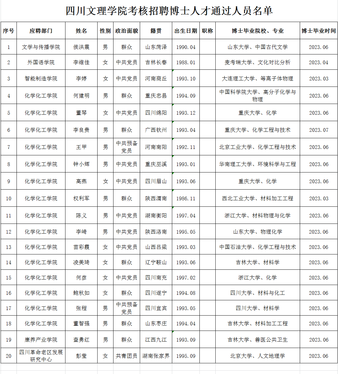 按照《pp电子官方网站高层次人才引进与管理办法》(川文理委〔2019〕84号),经过初试(初审)、复试考核程序,现将pp电子官方网站考核招聘2023年博士人才通过人员名单予以公布,请报考者注意查阅。
