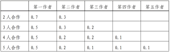 (四)所有合作成果均由负责人或第一作者统一登记在本部门,并标注每人分配比例,可参考以下比例:
