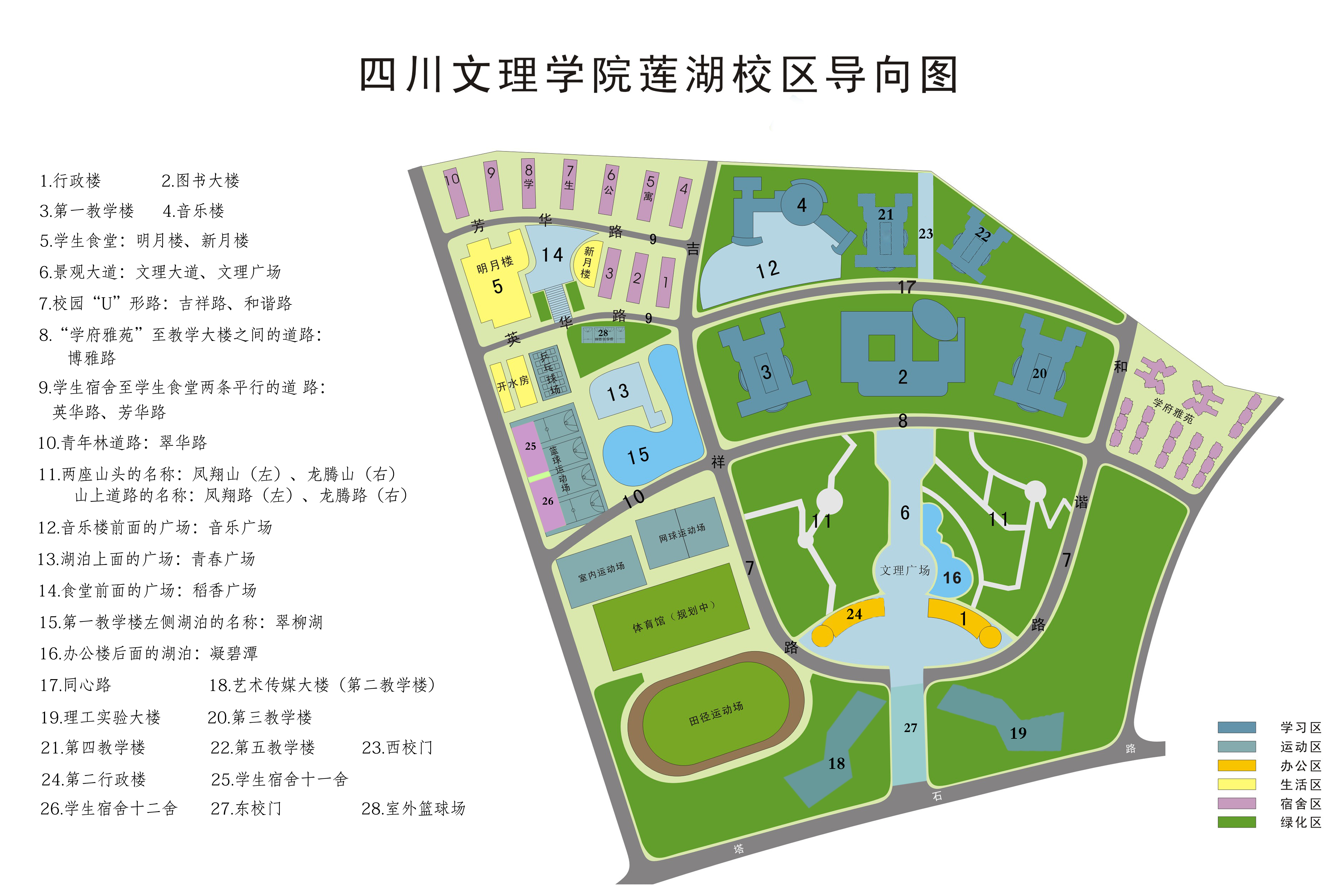 办公楼(1-2幢)、第一教学大楼、艺术传媒大楼、音乐教学楼、理工实验大楼、第三教学楼、第四教学楼、第五教学楼、康养培训大楼、体育馆、学生宿舍(1-12舍)及东校门、西校门。