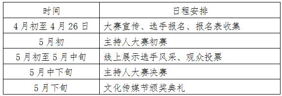 比赛通知→选手报名→作品征集→初评→公布复赛入围名单→公布决赛入围名单→决赛展示→评委评定→获奖作品展示→颁奖典礼。(注:初赛时间确定后,选手提前将PPT及策划案呈交至组委会,由观众投票和专业老师评定一同进行并计入结果,前十名进入决赛。