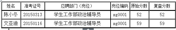 pp电子2015年5月公开招聘工作人员考试笔试总成绩公示后,至2015年6月9日11:30,共收到2名考生要求查分的申请。在学校纪委、监审处监督下,公招工作领导小组办公室工作人员组成联合查分小组核查,现将笔试总成绩查分结果公示如下: