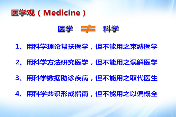 樊代明院士讲到:“形而上为哲学、形而下是科学,形而中为医学。”医学不等于科学。它非常复杂,“上下”联通,同时还涉及社会学、人类学、心理学、法学、经济学、艺术等。而且,医学非常注重结局,“有效无效,能不能治病,才是医学的根本”。因此,用科学的理论帮扶医学,但不能用之束缚医学;用科学的方法研究医学,但不能用之误解医学;用科学的数据助诊疾病,但不能用之取代医生;用科学的方法形成指南,但不能用之以偏概全。