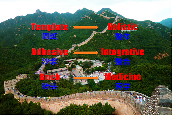 樊代明院士认为,整合医学应该是以人为本,从人的整体出发,将医学各领域最先进的知识理论和临床各专科最有效的实践经验分别加以有机整合,并根据社会、环境、心理的现实进行修整、调整,使之成为更加符合、更加适合人体健康和疾病治疗的认识论、方法学,其实施的结果是创造一种新的医学知识体系。它至少包括三个方面:整体观、整合观、医学观。创造新的医学知识体系,就像建造万里长城,它需要三个因素:一是图纸或模型(Template),一是沙浆(Adhesive),一是砖头(Brick)。三者必须同时具备,强调任何一个因素都是建不了或建不好万里长城的,而这当中最重要的是人。