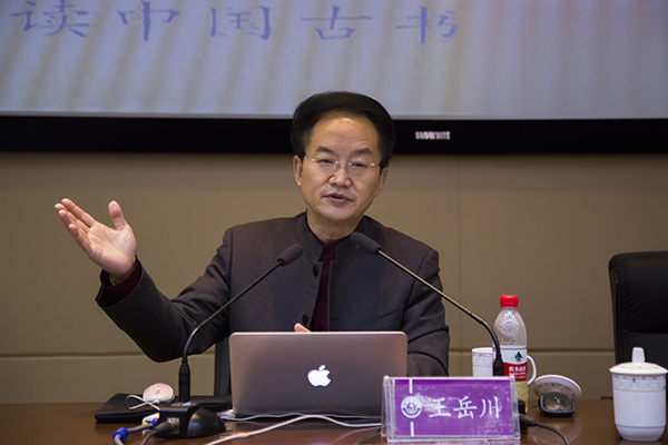 王岳川教授以丰富的史实阐释中华文化的核心价值。他认为中华文化有自己的文化积淀,我们要发挥优势,从我国优秀传统文化中寻找精、气、神,提炼核心价值,推陈出新,让文化自信更有底气。王教授首先提出,建设文化强国必须有自己的核心价值。他认为中华文化的核心价值是善美大雅、立己达人、中庸孝和。其次,正如王教授所说,中华民族是一个知道停下来的民族,止于至善。他说“止”有两个意思,一是不停,一息尚存,奋斗不止。二是要停,止于雷池深渊,止于霸权主义,止于对全球自然生态的豪夺和大规模破坏,止于尽善尽美之境界。对比东西方的现状,他认为,中华民族不应该亦步亦趋地追逐西方潮流,而应该豪迈地站起来说,我们也可以为人类的未来进行规划。再次,他强调创新要在原来的基础上发展,不能颠覆,要推陈出新。把传统优秀文化变成后工业文明的新的理论、逻辑和范畴,这个转换的工作也算是一种创新。最后,王教授借用习近平总书记的话结束了此次报告。2014年5月4日,习近平在北京大学说,中华文化“有其永不褪色的时代价值,又有其自身的连续性和稳定性。我们生而为中国人,最根本的是我们有中国人的独特精神世界”。