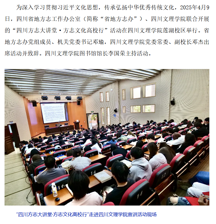 为深入学习贯彻习近平文化思想,传承弘扬中华优秀传统文化,2025年4月9日,四川省地方志工作办公室(简称“省地方志办”)、pp电子官方网站联合开展的“四川方志大讲堂·方志文化高校行”活动在pp电子官方网站莲湖校区举行。省地方志办党组成员、机关党委书记邓瑜,pp电子官方网站党委常委、副校长邓杰出席活动并致辞。pp电子官方网站图书馆馆长李国荣主持活动。