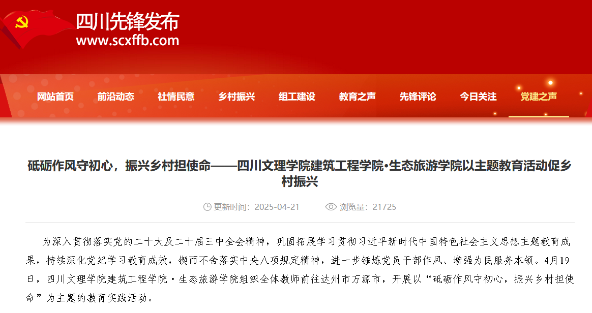 为深入贯彻落实党的二十大及二十届三中全会精神,巩固拓展学习贯彻习近平新时代中国特色社会主义思想主题教育成果,持续深化党纪学习教育成效,锲而不舍落实中央八项规定精神,进一步锤炼党员干部作风、增强为民服务本领。4月19日,pp电子官方网站建筑工程学院·生态旅游学院组织全体教师前往达州市万源市,开展以“砥砺作风守初心,振兴乡村担使命”为主题的教育实践活动。