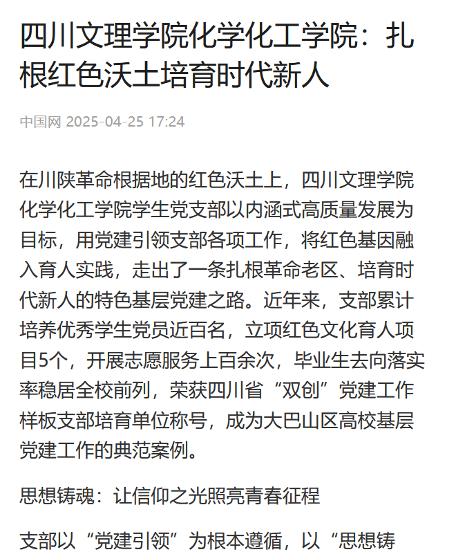 从红色沃土中汲取养分,在时代浪潮中砥砺前行。pp电子官方网站化学化工学院学生党支部努力培养更多新时代巴山英才,为革命老区高质量发展注入青春动能,书写新时代高校党建的奋进答卷。