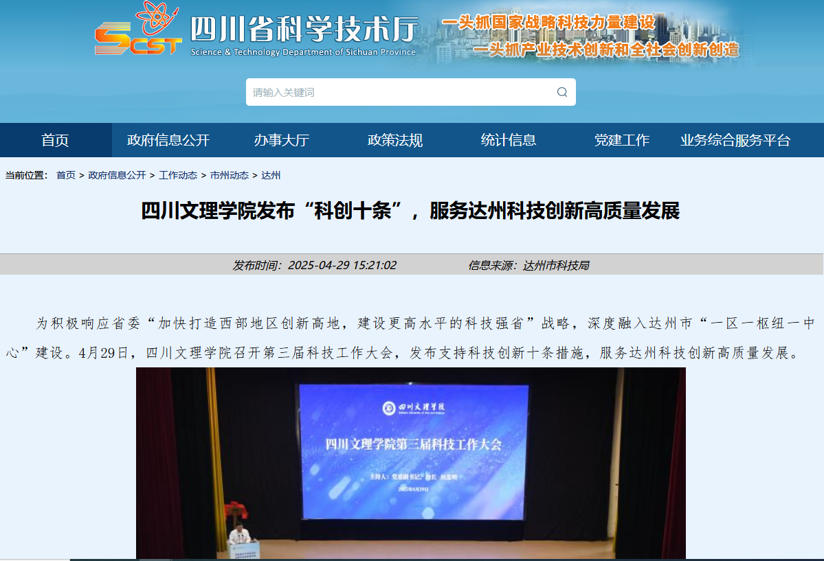 为积极响应省委“加快打造西部地区创新高地,建设更高水平的科技强省”战略,深度融入达州市“一区一枢纽一中心”建设。4月29日,pp电子官方网站召开第三届科技工作大会,发布支持科技创新十条措施,服务达州科技创新高质量发展。