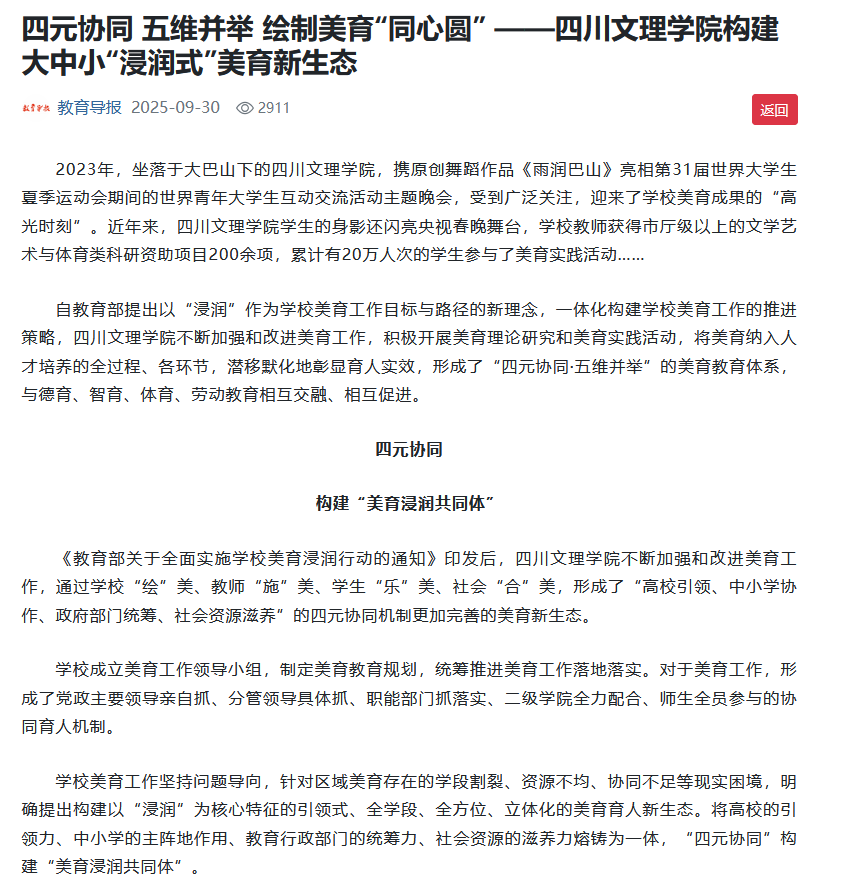 学校美育工作坚持问题导向,针对区域美育存在的学段割裂、资源不均、协同不足等现实困境,明确提出构建以“浸润”为核心特征的引领式、全学段、全方位、立体化的美育育人新生态。将高校的引领力、中小学的主阵地作用、教育行政部门的统筹力、社会资源的滋养力熔铸为一体,“四元协同”构建“美育浸润共同体”。