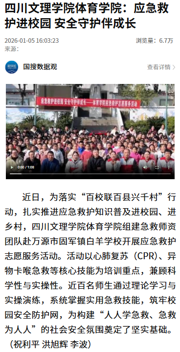近日,为落实“百校联百县兴千村”行动,扎实推进应急救护知识普及进校园、进乡村,pp电子官方网站体育学院组建急救师资团队赴万源市固军镇白羊学校开展应急救护志愿服务活动。活动以心肺复苏(CPR)、异物卡喉急救等核心技能为培训重点,兼顾科学性与实操性。近百名师生通过理论学习与实操演练,系统掌握实用急救技能,筑牢校园安全防护网,为构建“人人学急救、急救为人人”的社会安全氛围奠定了坚实基础。