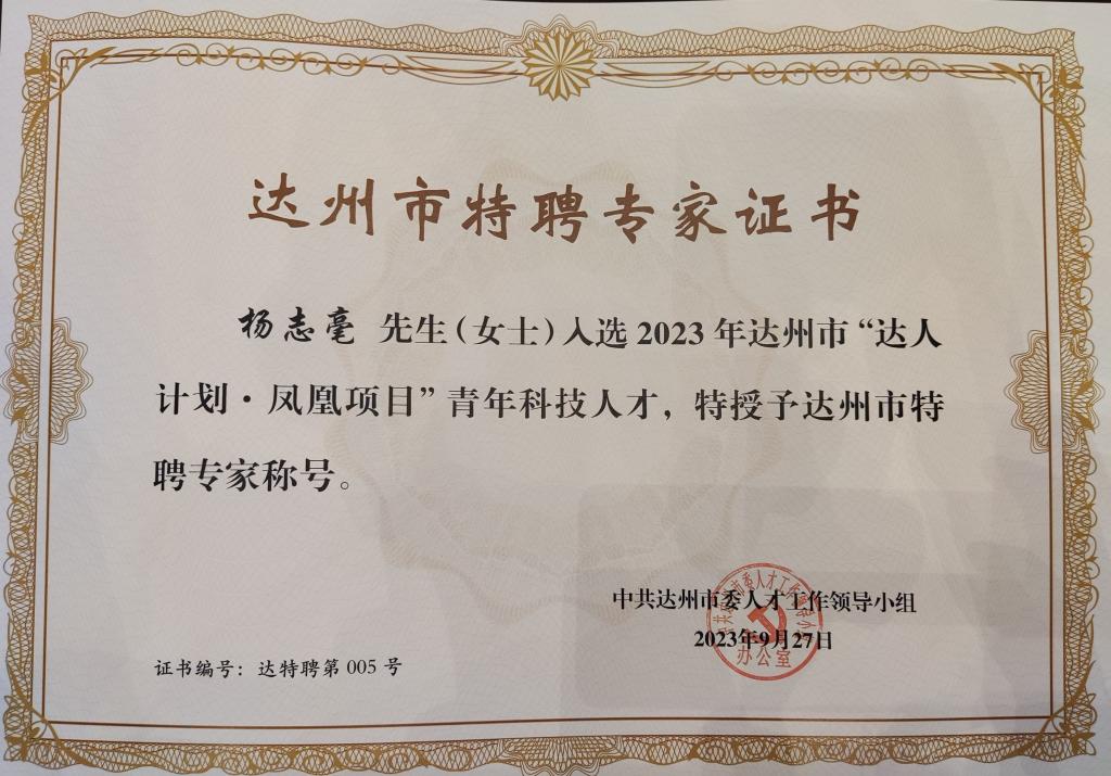 入选2023年达州市“达人计划▪凤凰项目”青年科技人才证书