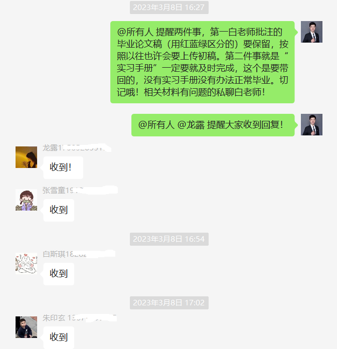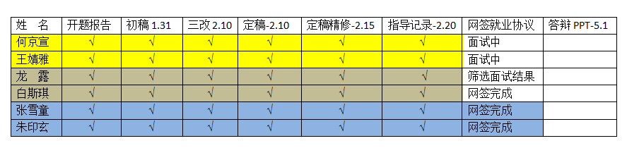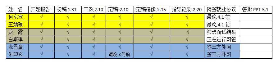 白海老师把毕业论文指导与实习就业指导统筹规划,无缝衔接,打足提前量。白老师指导了6位学生。他制定了详细的动态时间表,学生每个时间点要完成什么工作一目了然,每完成一项就会打勾确认,即使完不成,也会继续鼓励他们,帮助他们,让他们提前保质保量地完成。他规定,2月15日前完成毕业论文定稿,并且拿到“论文查重”报告,3月就开始全身心投入就业工作。白老师知道3月份的“春招”是就业黄金期,必须给学生留足充裕的时间找工作。这样学生才不至于同时面临毕业论文和就业的双重压力。打开这个动态时间表,满满的√让人欣慰和感动。在白老师的指导下,所有同学如约完成每项工作,无一人落下。