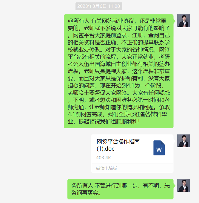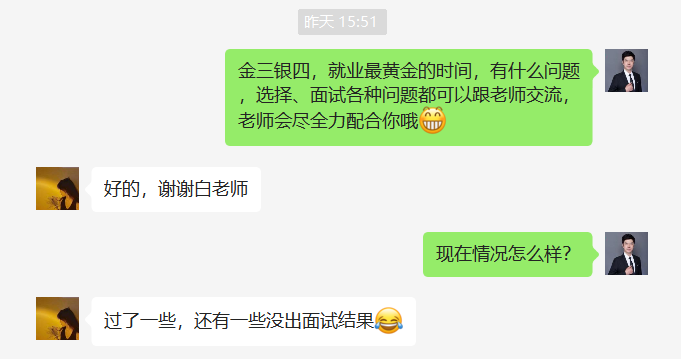 当问到为什么做这个动态时间表时,白老师说,要给学生提前做系统规划,要稳定学生的心。学生第一次毕业,第一次找工作,真的很懵,茫然无措。作为过来人,我们首先要让学生的心稳定下来、冷静下来。白老师找每一位同学谈心,详细了解每个孩子最真实的想法和就业现状,并告诉他们目前的就业形势和就业政策,并有针对性地给出就业建议。目前已经有3个孩子完成网签,1个孩子正在筛选面试结果,2个孩子正在面试中。龙露同学说:“白老师真的非常认真负责,而且对我们每个人都一视同仁,他给我们制定了时间表,让我们忙而不乱、忙而不慌。在白老师的指导下,我已经拿到了4个offer,现在正在分析、挑选中,接下来就会网签”。