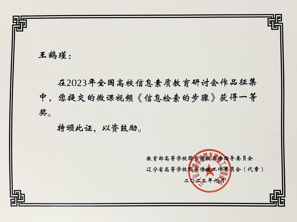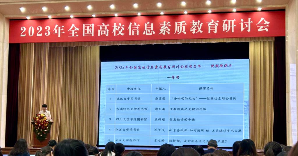 9月21日至23日,2023年全国高校信息素质教育研讨会在沈阳召开,pp电子图书馆青年教师郭碧玉、王鹤瑾参加研讨会,王鹤瑾老师获微课视频一等奖。