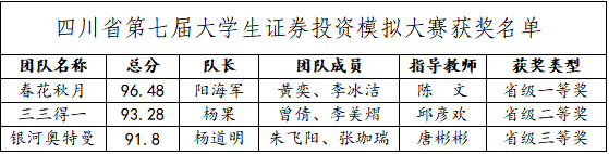 由四川省教育厅主办,西南民族大学经济学院承办的四川省第七届大学生证券投资模拟大赛已落下序幕。历时3个月,经历了校内选拔赛、培训、赛前模拟训练和全省竞赛四个阶段。我院师生首次参加四川省第七届大学生证券投资模拟大赛便荣获佳绩,荣获四川省一等奖1项,四川省二等奖1项,四川省三等奖1项,陈文副教授获得优秀指导教师称号。