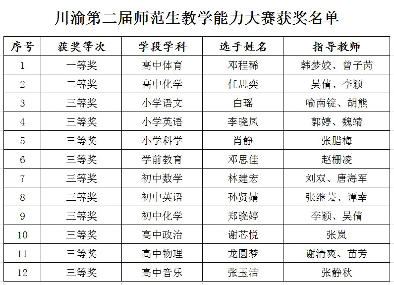 近日,四川省教育厅、重庆市教委公布了川渝第二届师范生教学能力大赛获奖名单,pp电子学子喜获一等奖1项,二等奖1项,三等奖10项。指导教师韩梦姣、曾子芮被授予“优秀指导教师”称号。