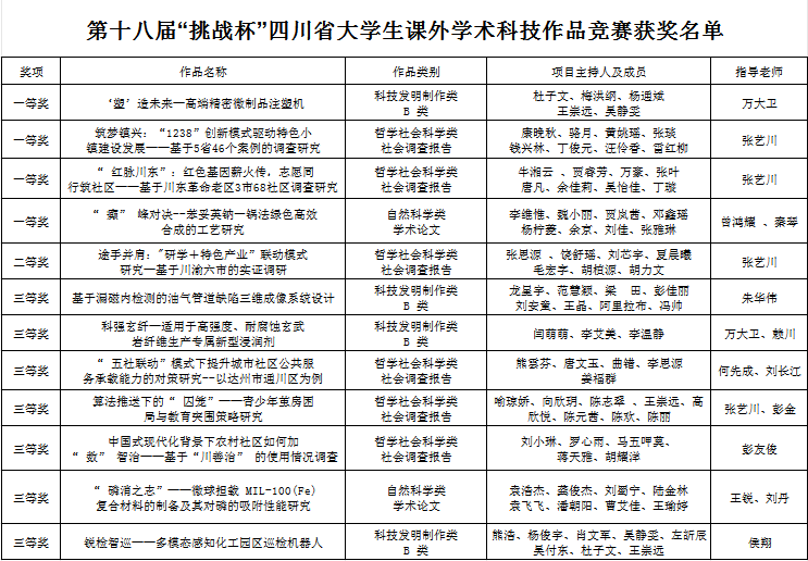 本届大赛,共吸引四川省121所高校、18万余名青年学生参与,共计报送2.2万件作品,近1400件作品进入省赛初评,505件作品进入省赛终审决赛。经过激烈角逐,pp电子获一等奖4项,二等奖1项,三等奖7项,推荐的12个项目全部获奖,再创pp电子“挑战杯”省赛成绩历史新高。