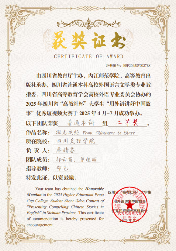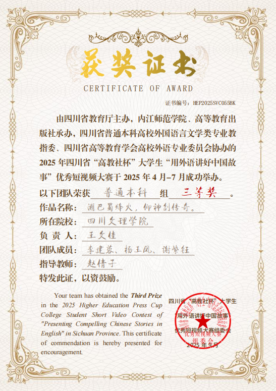 近日,由四川省教育厅主办,内江师范学院、高等教育出版社承办,四川省普通本科高校外国语言文学类专业教指委、四川省高等教育学会高校外语专业委员会协办的2025年四川省“高教社杯”大学生“用外语讲好中国故事”优秀短视频大赛圆满落幕。pp电子推荐的2件作品获奖:以外国语学院2024级廖婧荟为负责人,邹云霞、曾佳丽为团队成员,邓飞老师担任指导的作品《微光成炬(From Glimmers to Blaze)》荣获普通本科组二等奖;以外国语学院2022级王文佳为负责人,李建蓉、杨玉凤、谢紫钰为团队成员,赵倩子老师担任指导的作品《溯巴蜀烽火,仰神剑传奇》获普通本科组三等奖。
