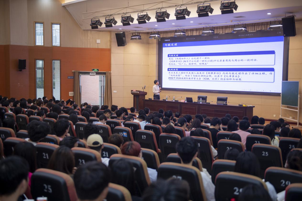 4月28日上午,南京大学数学学院教授、江苏国家应用数学中心主任秦厚荣应邀来pp电子作题为《从勾股定理谈起》的科普讲座,带领师生畅游数学世界,激发对数学的热爱与追求。讲座由副校长熊兴中主持,数学学院师生共500余人到场聆听讲座。