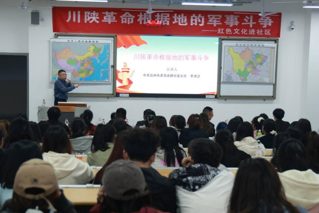 为丰富学生社区文化内容,提升学生社区综合育人实效。4月9日晚,中共达州市委党史研究室主任李洪卫应邀为学生作题为“川陕革命根据地的军事斗争”的讲座。